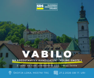 V Škofji Loki bo 27.2.2026 ob 17 uri potekala uradna predstavitev kandidatk in kandidatov Slovenske demokratske stranke (SDS) za 1. volilno enoto, ki bo na prihajajočih državnozborskih volitvah 22. marca 2026 zastopala interese gorenjske regije in okoliških območij.