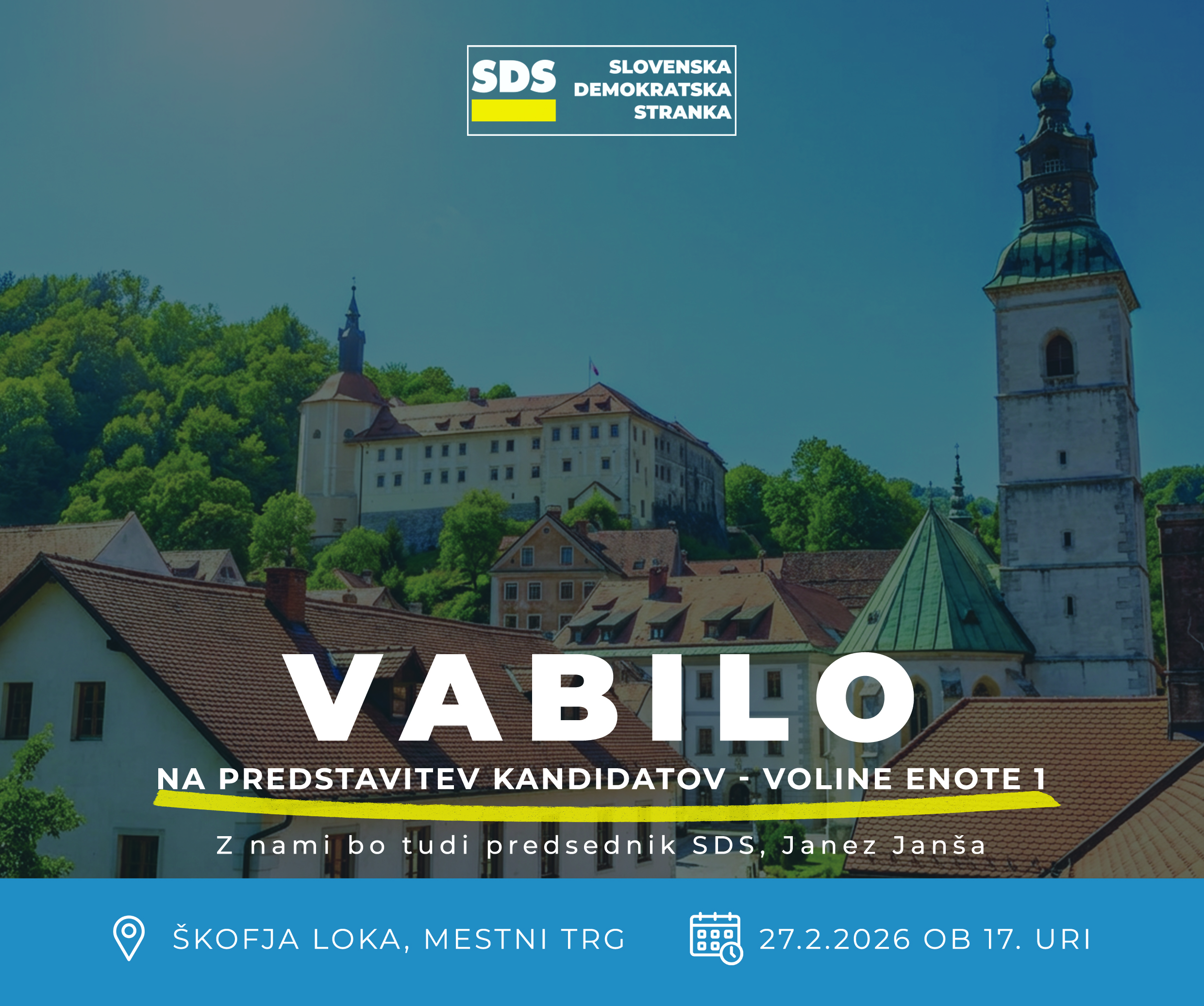 V Škofji Loki bo 27.2.2026 ob 17 uri potekala uradna predstavitev kandidatk in kandidatov Slovenske demokratske stranke (SDS) za 1. volilno enoto, ki bo na prihajajočih državnozborskih volitvah 22. marca 2026 zastopala interese gorenjske regije in okoliških območij.