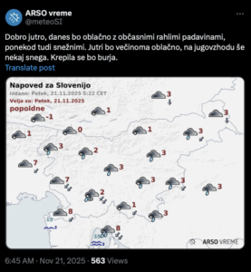Vremenoslovci so napovedali sneženje in so imeli prav. Po Sloveniji so se že začele snežne padavine, ki so pobelile višje predele, medtem ko je drugod sneg mešan z dežjem. Agencija Republike Slovenije za okolje (ARSO) je izdala oranžno opozorilo, medtem ko hrvaški meteorologi opozarjajo na še hujše vremenske razmere z rdečim alarmom.