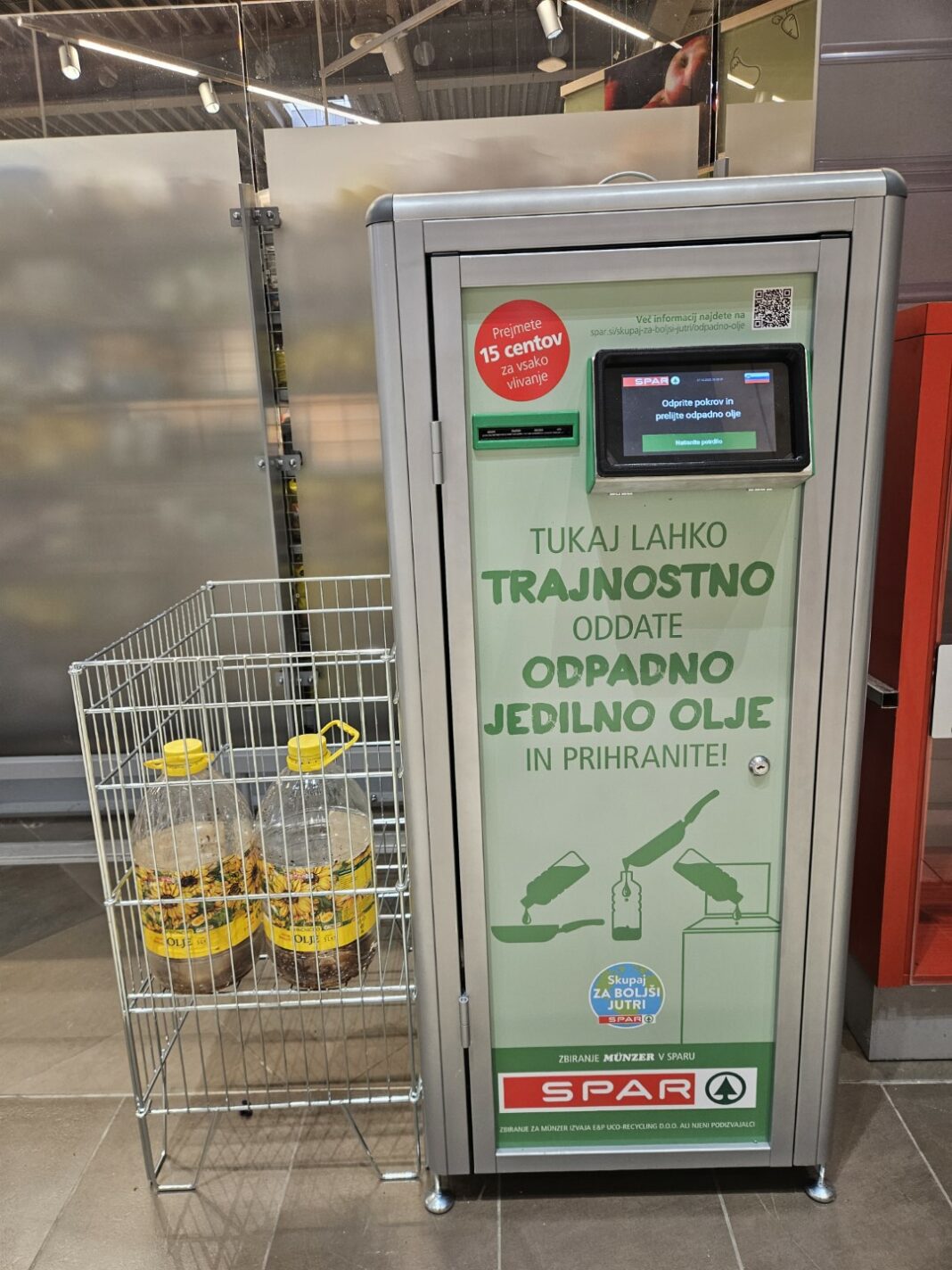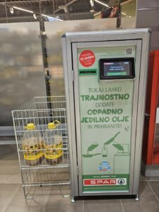 Trajnostno delovanje in odgovornost do okolja sodita med strateške usmeritve in prioritete podjetja Spar Slovenija. Njihov glavni cilj je, da svojim kupcem v trgovinah omogočajo nakupovati in živeti bolj trajnostno. V ta namen so v INTERSPARU Kranj in v SPARU Kranj Planina pred vhodom v trgovino na vidno mesto postavili dva nova zbiralnika odpadnega jedilnega olja. Kupci lahko sedaj odpadno jedilno olje oddajo na preprost in priročen način, v zameno pa prejmejo kupon kot zahvalo za odgovorno ravnanje.